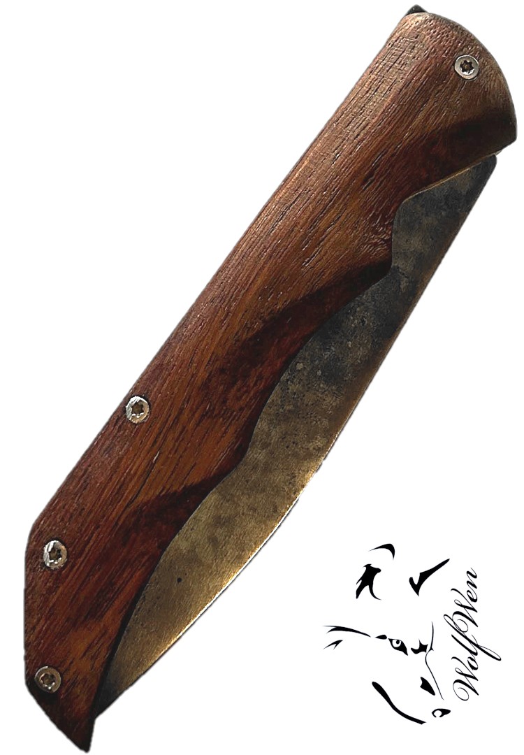- Manche : Le manche ergonomique est façonné dans un bois massif dense, poncé et traité pour une prise en main confortable. Son design légèrement incurvé assure un maintien optimal et un contrôle précis. Les finitions, renforcées par des vis métalliques visibles, ajoutent une touche moderne et durable au couteau.